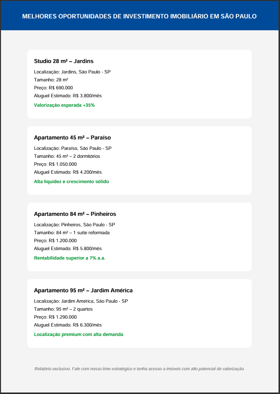 Você terá acesso aos mesmos dados e análises que investidores experientes usam para tomar decisões seguras e rentáveis no mercado imobiliário
